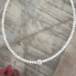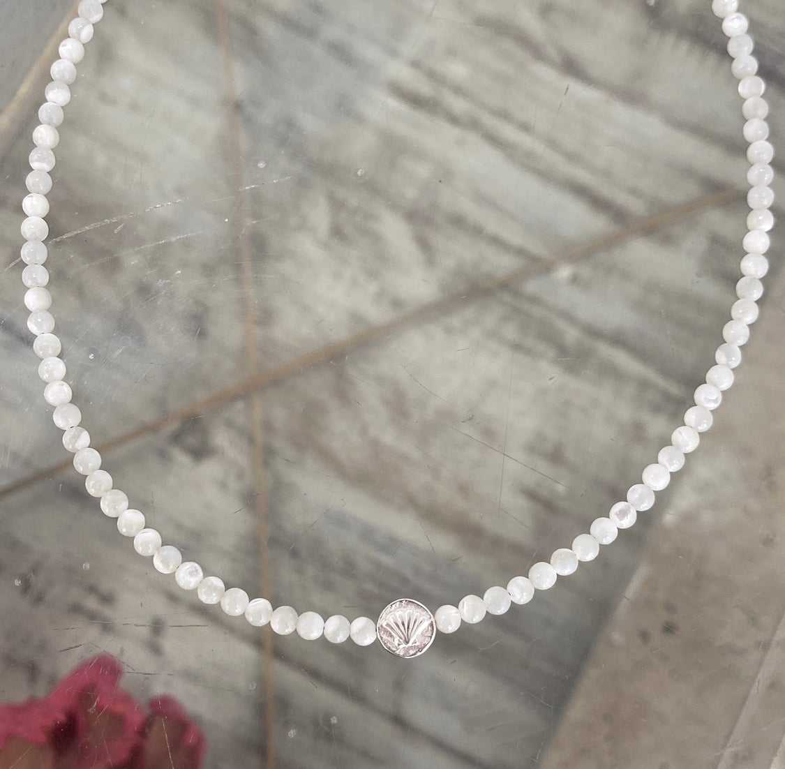 Inspired by the gentle rhythm of ocean tides, the Beach Dreams Mother of Pearl Choker features a strand of luminous mother of pearl beads strung delicately around the neck, finished with a dainty sterling silver shell charm at its centre.