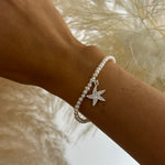Dive into seaside bliss with our dainty seed freshwater pearl bracelet detailed with a sparkling starfish detailed with cubic zirconias.