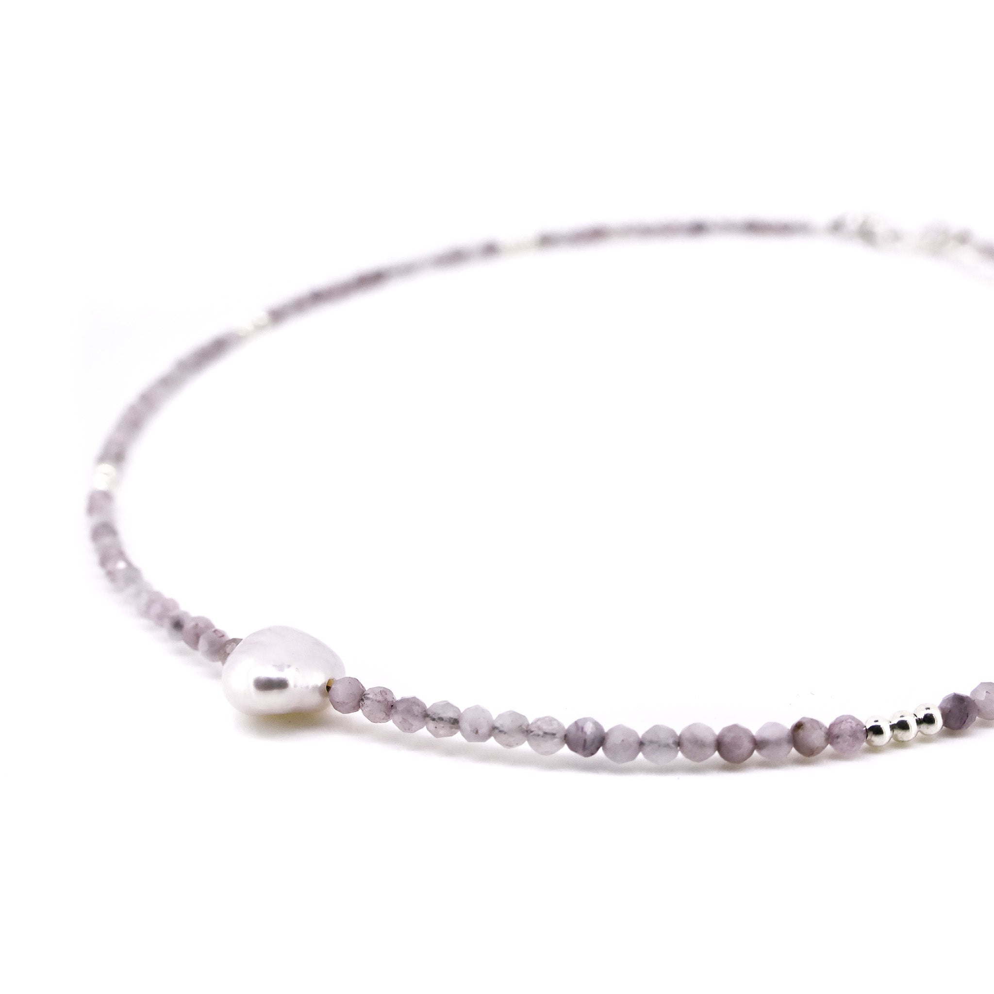 Soft, feminine and effortlessly coastal, the Coastal Blush Kunzite Necklace captures the gentle beauty of ocean light and shoreline calm. Featuring faceted 4mm kunzite gemstones in delicate blush tones, this necklace is finished with polished sterling silver accents and a single, organic keshi freshwater pearl at its centre.