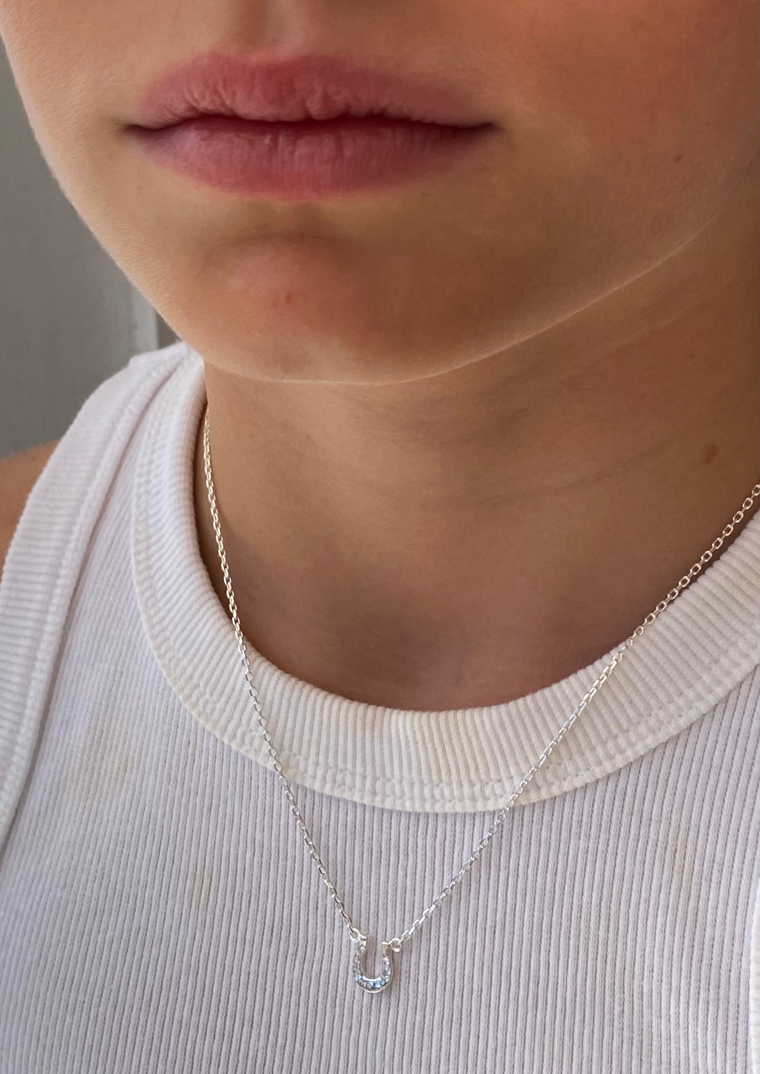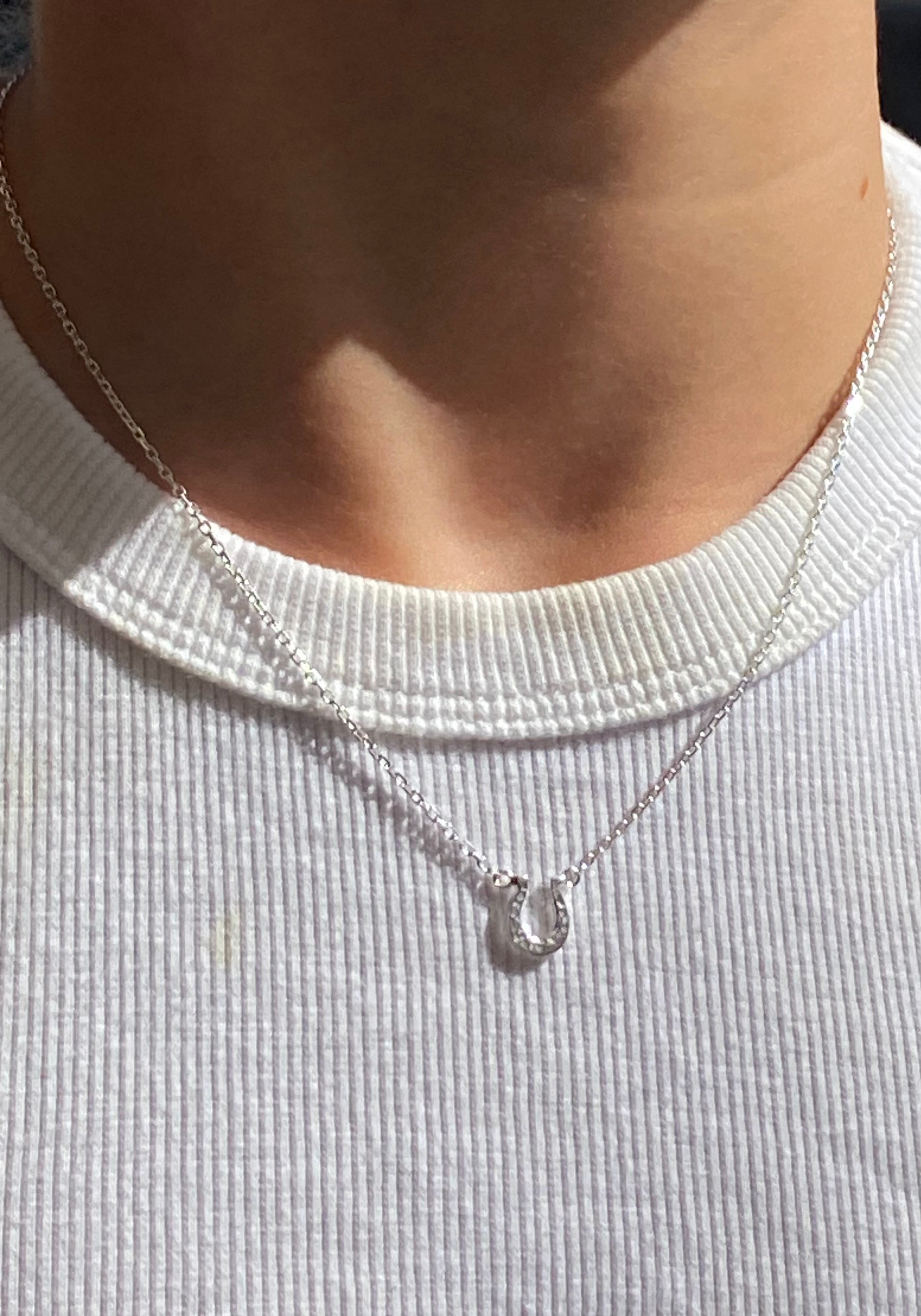 Hand crafted with meticulous attention to detail, this dainty sterling silver necklace feature a petite horseshoe with a hammered finish, creating a textural allure that catches the light with every movement. The glisten of sterling silver enhances the rustic charm, adding a touch of effortless grace to this dainty necklace.