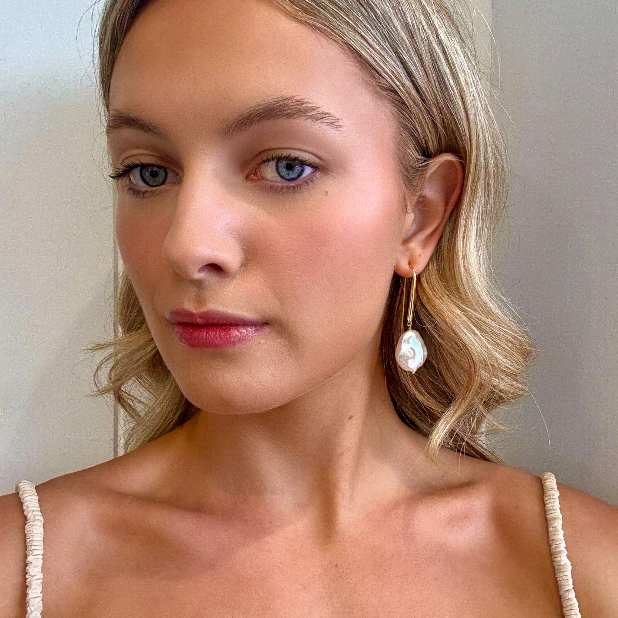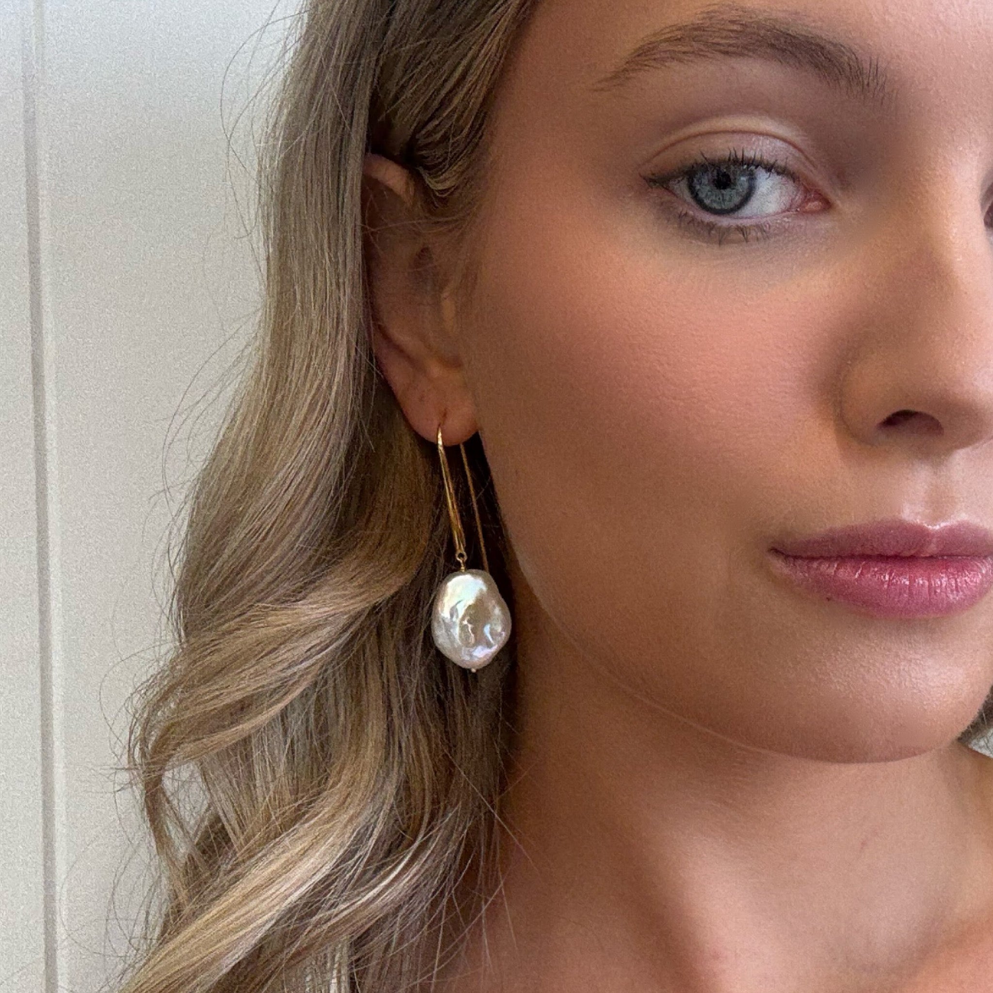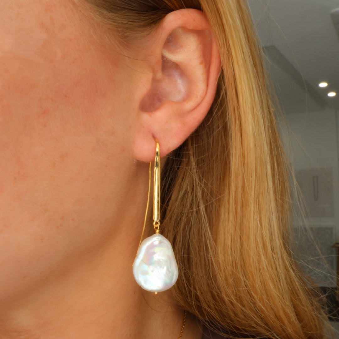 Elevate your coastal luxe style with our Betty Baroque Pearl Hook Earrings — featuring extra-large 20mm baroque freshwater pearls suspended from premium gold vermeil hooks. Each pearl has its own unique, organic curves and glowing lustre, making every pair truly one of a kind.