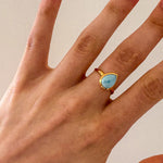 Capture the serene beauty of the Caribbean with our Island Hues Larimar Ring. This dew drop shaped Larimar gemstone shimmers in oceanic blues and soft whites, reminiscent of tropical waves and island skies.