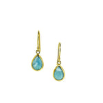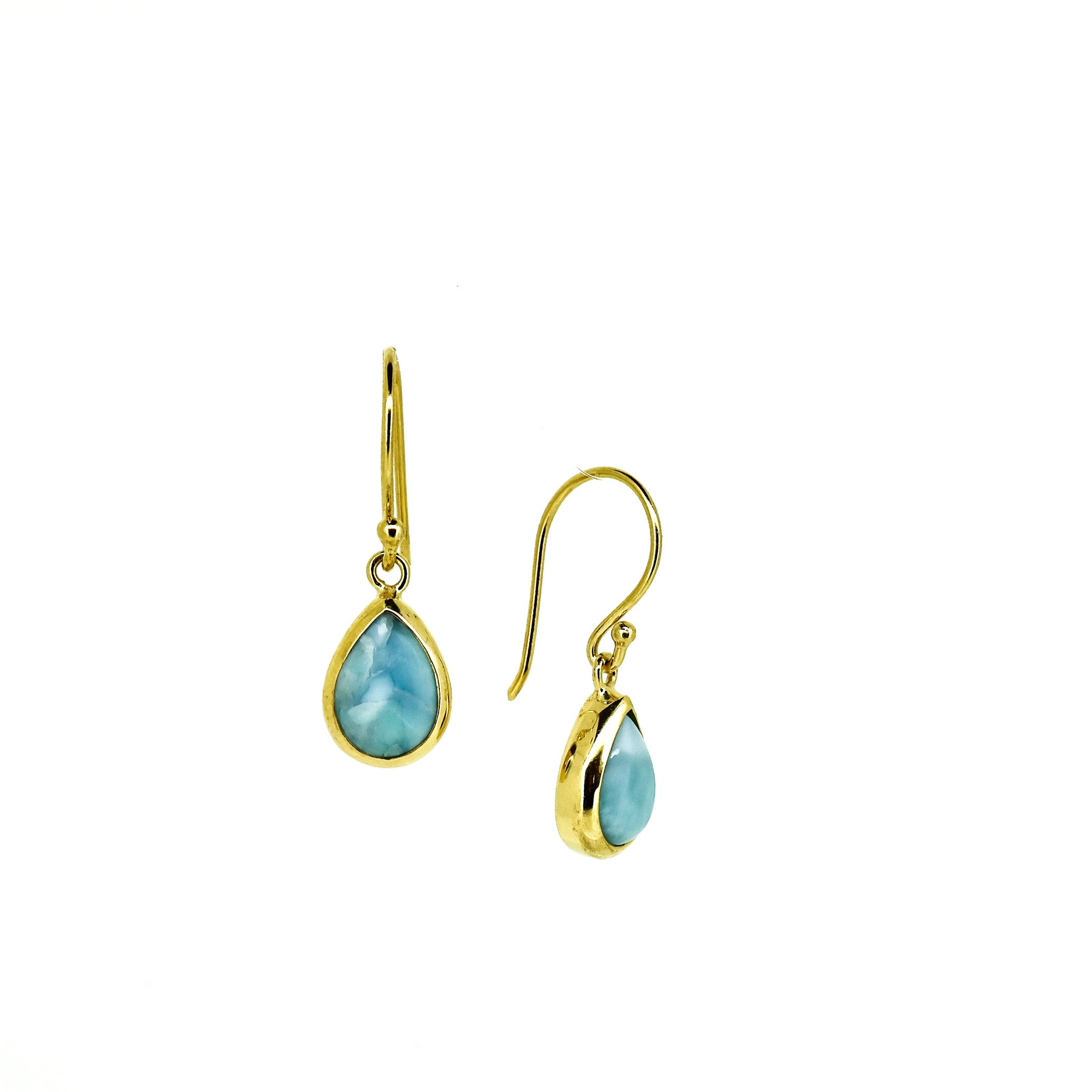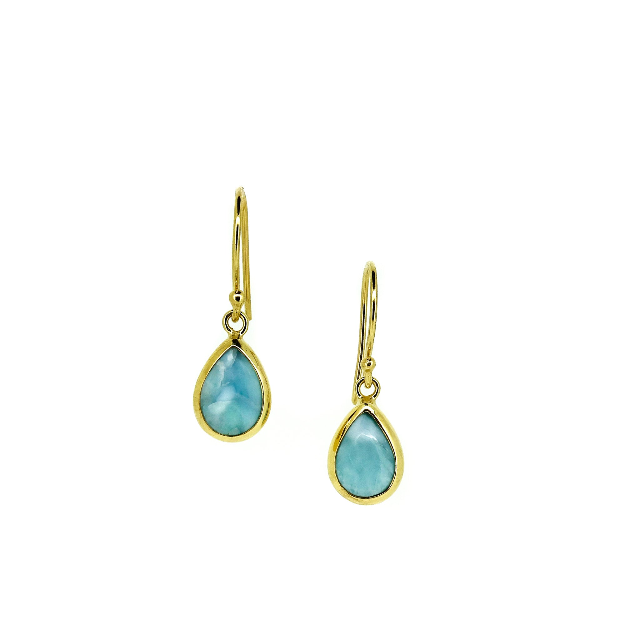 Each earring showcases a genuine 10 mm x 7 mm Larimar gemstone hand-shaped into an elegant dew drop profile, its natural ocean-blue marbling unique to every stone.