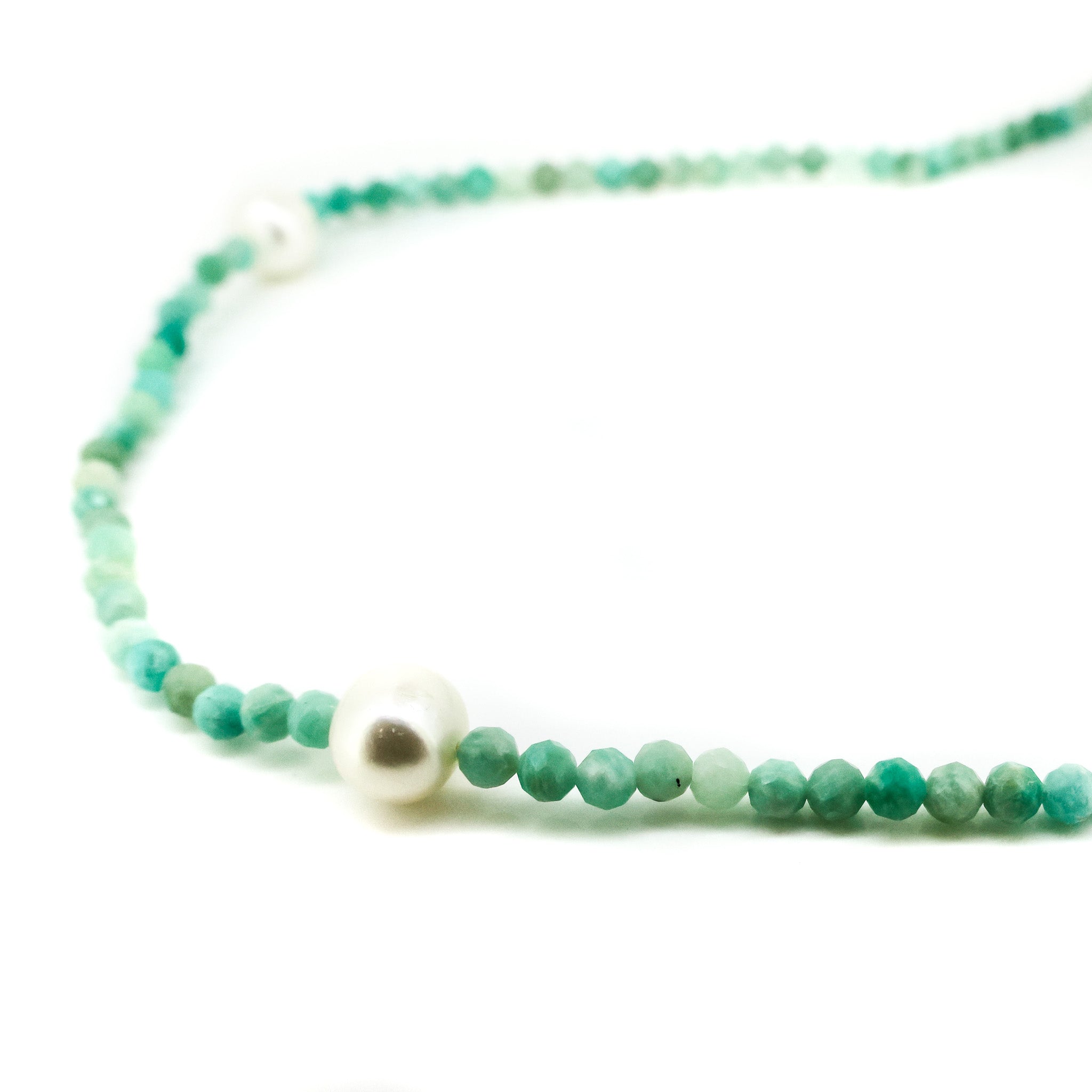 Dive into the serene beauty of the ocean with our exquisite necklace, intricately hand crafted with faceted amazonite gemstones interspersed with seven freshwater pearls. Each piece of Amazonite, with its captivating sea-green hue, is reminiscent of the tranquil waves kissing golden sands. Adorned with lustrous freshwater pearls that gleam like moonlight dancing on the ocean’s surface, this necklace is a symphony of nature’s elegance and grace.