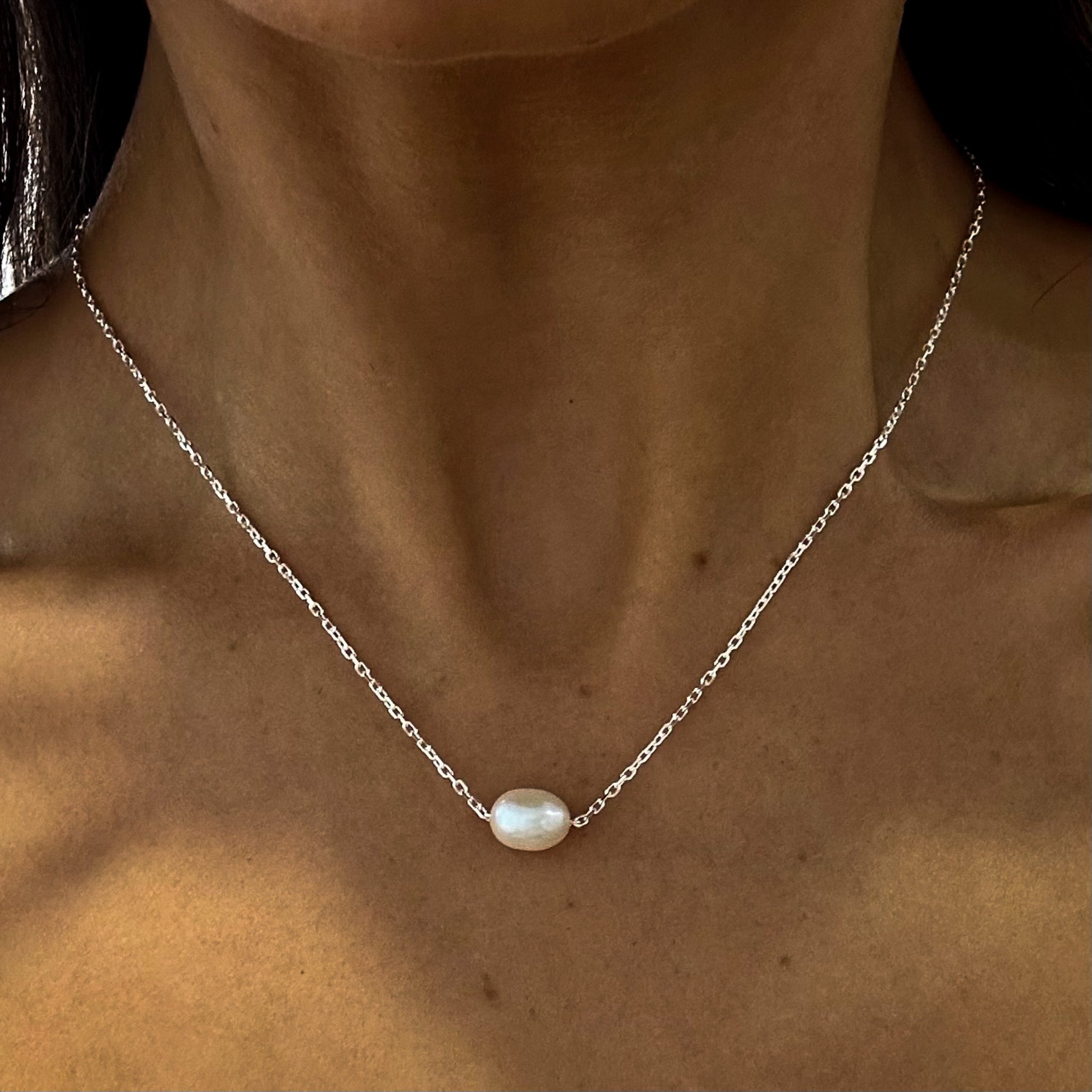 Like the shimmer of sunlight on calm water, the Seaside Glow Silver Necklace captures natural beauty in its purest form. This delicate piece features a fine sterling silver chain centered with a single lustrous freshwater pearl—a soft, glowing accent that evokes coastal serenity and timeless style.