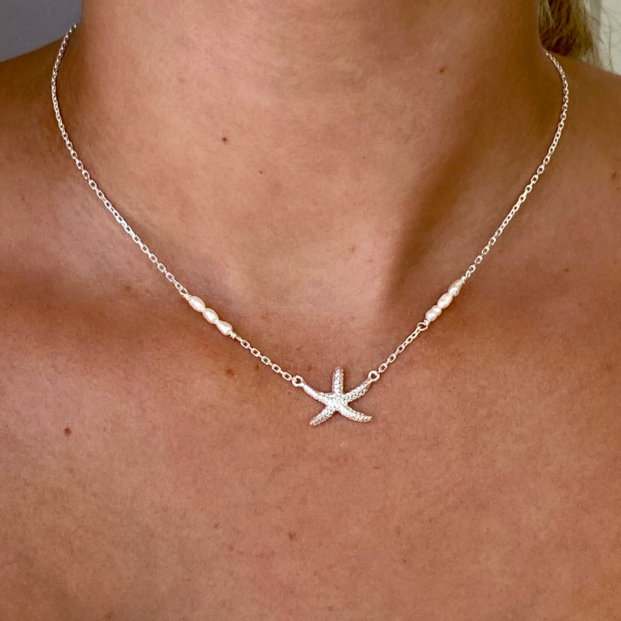 This dainty sterling silver necklace features a shimmering starfish centerpiece, accented on either side by clusters of petite rice-shaped freshwater pearls. The soft luster of the pearls paired with the sparkle of the starfish creates a look that’s effortlessly radiant and undeniably ocean-inspired.