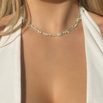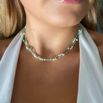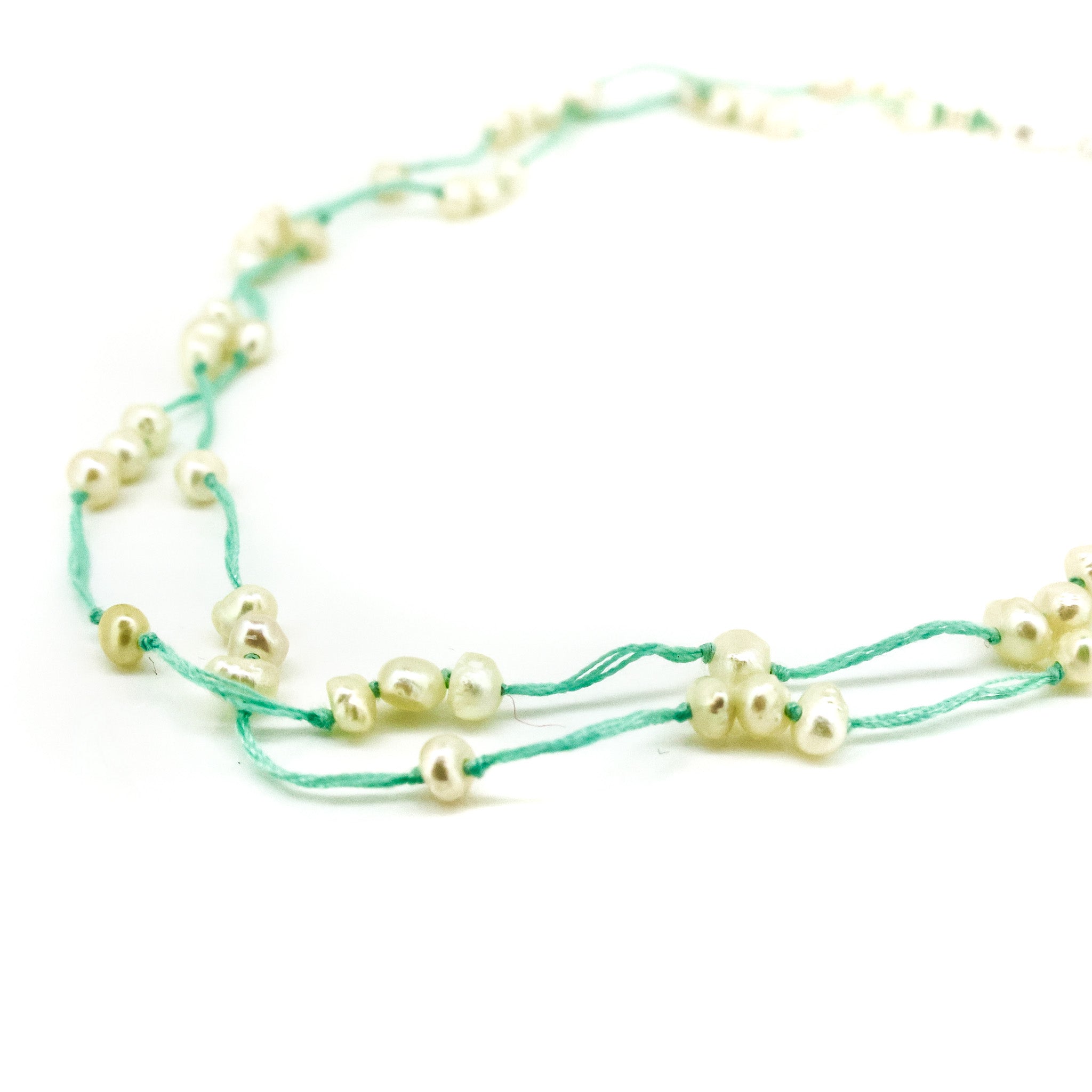 Embrace the summer sun in one of our dainty pearl necklaces hand crafted on sturdy cotton the colour of seamist with an adjustable sterling silver clasp.