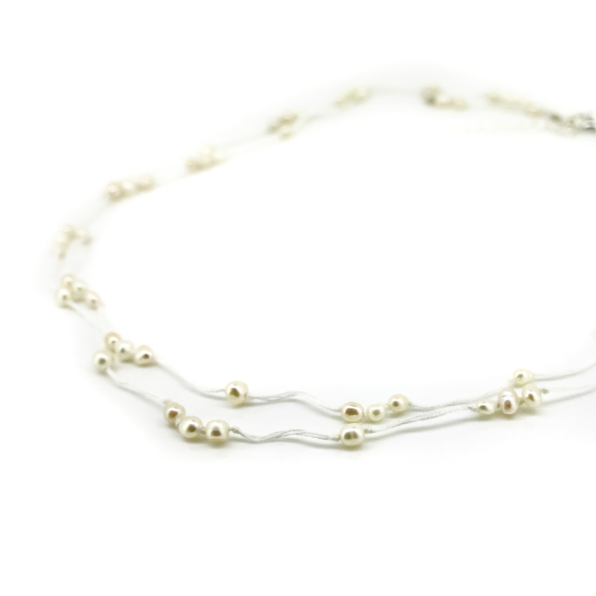 Embrace the summer sun with this pearl necklace hand crafted on sturdy white cotton strands.